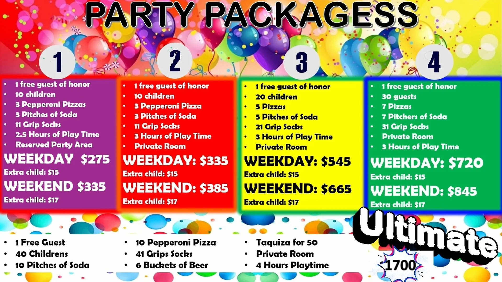 **Please, no outside food, drinks or alcohol allowed. We sell a variety of snacks, drinks, and pizza beer and wine at the snack bar. Plus tax on all sales including party packages.